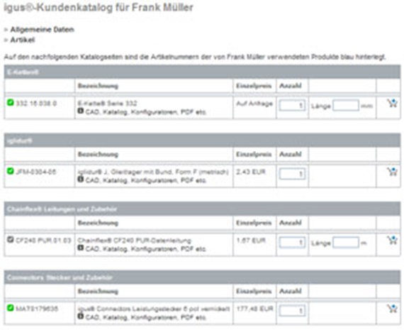 Con su propio catálogo "do-it-yourself", cada cliente puede elaborar su propia selección de los componentes más relevantes para él y todo directamente desde nuestra cartera de productos igus®. De este modo, inmediatamente después de iniciar sesión, se puede mostrar en el espacio myigus, una visión general de los diferentes artículos seleccionados individualmente .