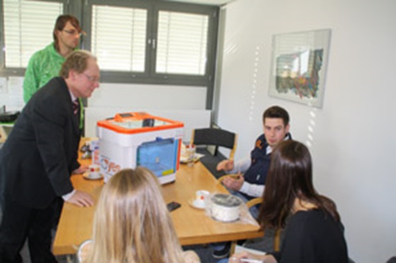 Acto de entrega de la impresora 3D con la presencia del profesor de física Thomas Kerschner (al fondo), el director del centro Wolfgang Knoch (derecha), el representante de igus® Albert Thönniges (izquierda) y algunos de los alumnos del instituto Otto Hahn de Bensberg.