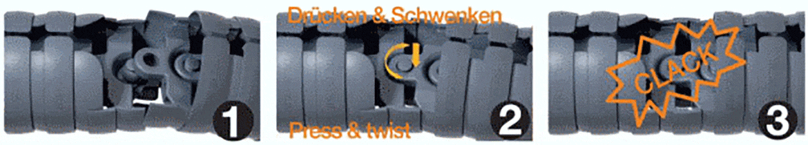 Debido a la mayor estabilidad de la versión B, se requiere una herramienta de desmontaje para separar los eslabones de la Cadena portacables.