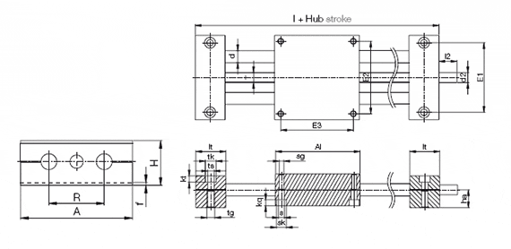 | Número de pedido | Longitud de la carrera | Peso adicional eje de acero | Máx. capacidad de carga estática | A | Al | H | E1 | E2 | E3 | ||||