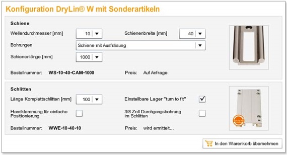 Se puede elegir entre diferentes diámetros de ejes y anchos de raíl también se puede seleccionar raíles mecanizados, de peso reducido o con un patrón determinado de agujeros perforados. Usted puede especificar la longitud individual del raíl y el precio se calcula automáticamente. Después la misma herramienta pre-selecciona el carro apropiado para el raíl; también la longitud del carro se puede ajustar. Además también se pueden seleccionar las opciones de "cojinete regulable en holgura" o "freno manual". Tanto el raíl como el carro pueden ser transferidos directamente al carrito de la compra con su correspondiente precio. También puede indicarnos allí mismo el número de componentes que requiera para dicho pedido.