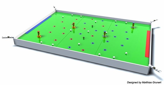 14 hoyos rojos y 14 hoyos azules están repartidos sobre una superficie de 2x3 metros . Al principio del juego, 15 bolas blancas y dos negras se reparten sobre el terreno de juego. Cuatro tótem están encargados de repartir nuevas bolas; cada uno vehicula 4 blancas y una negra.