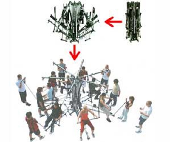 Los Cojinetes de deslizamiento igus® eran los pequeños ayudantes en la construcción de este equipo fitness innovador.  El Body-Spider® de la empresa KOOPERA GmbH es un equipo multifuncional con el cual hasta 18 personas pueden ejercerse simultáneamente. El equipo permite realizar diferentes ejercicios para el entrenamiento de la musculatura y de la coordinación de diferentes partes del cuerpo.