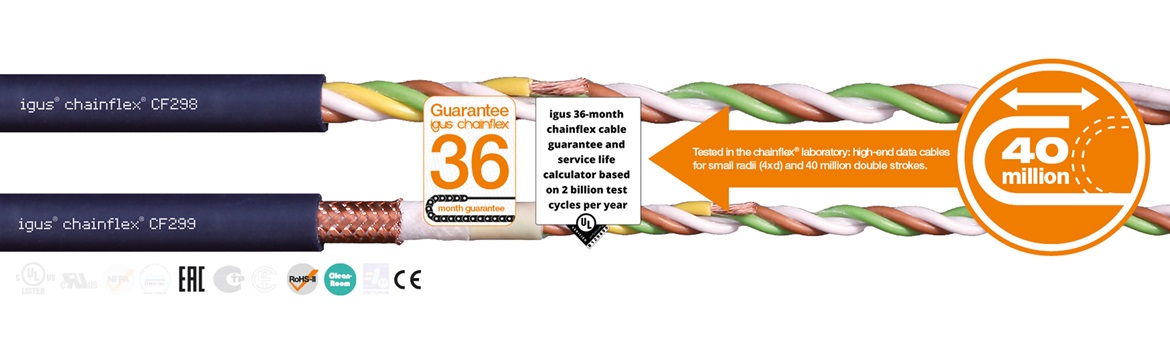 Las aplicaciones dinámicas con radios de curvatura muy reducidos propician que los cables convencionales con conductores de cobre alcancen su límite de tensión mecánica y se rompan. Precisamente para estos casos, ahora igus garantiza 40 millones de carreras dobles para sus cables de datos de las series CF298 (sin apantallar) y CF299 (apantallados) con el factor de flexión más pequeño (4xd) para cables de datos para movimiento en cadenas portacables. Esto es posible principalmente por la combinación del nuevo material conductor de aleación de alto rendimiento y el revestimiento exterior de TPE de igus muy resistente a la torsión, que evita grietas y roturas.