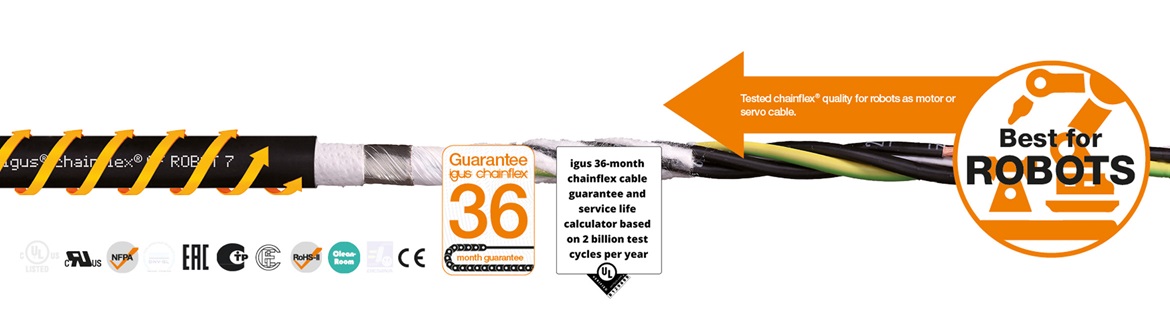 La característica especial: Aunque las exigencias para este cable son muy altas, se aplica la misma garantía que en todos los cables de chainflex: 36 meses. ¿Qué tiene eso de especial? Los cables para altas torsiones también son producidos por otros fabricantes. Sin embargo, ninguno de ellos afirma con exactitud cuánto tiempo durará el cable en uso ni ofrece una garantía. Con chainflex, el calculador de vida útil le indica exactamente cuánto tiempo durará el cable y cuándo debe ser reemplazado. Esto es posible gracias al "Estándar de prueba de torsión" de igus, que se basa en resultados de pruebas significativas y comparables. De acuerdo con este estándar, todos los cables CFROBOT chainflex se someten un mínimo de 5 millones de torsiones de prueba en un sistema de suministro de energía triflex R, con una distancia definida de un metro y una torsión de ±180°; naturalmente, el nuevo cable CFROBOT7 también tuvo que probarse con estas condiciones.