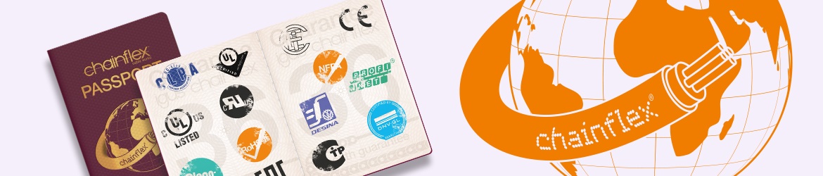 Por eso, para los cables chainflex hemos hecho especial hincapié en el cumplimiento de todas las directrices y reglamentos de aprobación de las normas más importantes en todo el mundo. Por lo tanto, encontrará el cable adecuado para casi cualquier requisito del mundo.