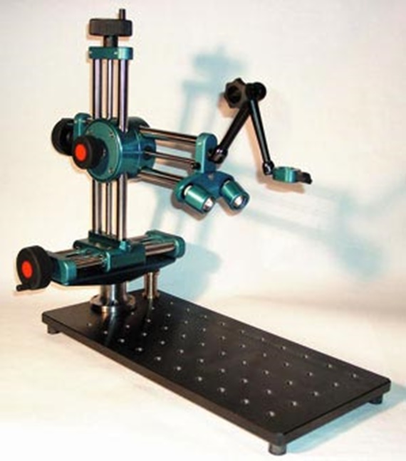 Este soporte sostiene una pistola de soldar equipada con un husillo de accionamiento y una lámpara para tareas de soldadura de alta precisión.