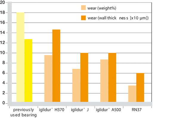 El cojinete apto para movimientos giratorios (material en contacto de PP reforzado con fibra de vidrio gira a 100 r. p. m.) presentó problemas tras superar tan solo el 25% de su vida útil esperada al estar en agua caliente a una temperatura de 50 °C y con productos de limpieza. El desgaste en forma de pequeños fragmentos provoca el acortamiento del casquillo. Debido a la alta resistencia química del material, el cliente excluyó los productos de limpieza como causa de este desgaste.