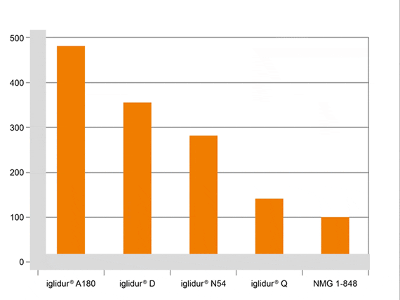 De este modo, tres materiales con perfiles característicos parcialmente muy diferentes consiguen una mejora en comparación con iglidur® G. De este modo, el material de alta resistencia iglidur® Q y también el nuevo desarrollo NMG1-848 se comportaron mejor, con diferencia, con una tensión de 26 MPa, que situamos en el rango de carga media, aunque la proporción predominante de las aplicaciones típicas de cojinetes de fricción muestran cargas radiales todavía significativamente menores. En este caso es posible que la vida útil incremente 4 veces.