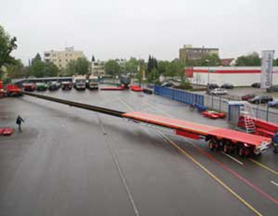 This vehicle was especially designed for the transport of windcraft wings. The platform semitrailer can be extended to an entire length of 62 metres. This allows the transport of even extremely long wings. To ensure safe unrolling of electric, brake and hydraulic cables in the inner tubes, the emphasis is put on e-chains® of the series E4.1 from igus®. Its construction principle of the so-called rear grip ensures very high stability.